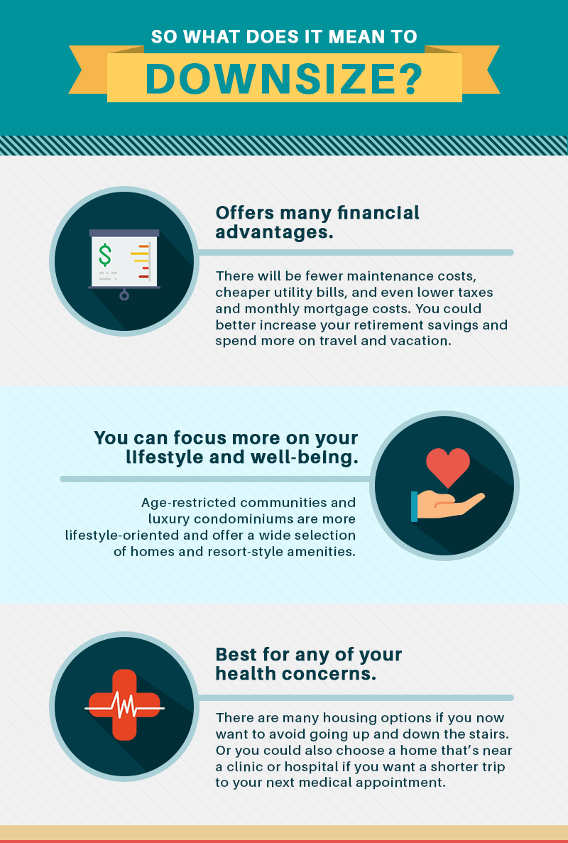 Offers many financial advantages. While your six-bedroom farmhouse with a spacious garden holds so many memories of your children, maintaining it now takes time and has larger costs compared to living in a two-bedroom flat. Downsizing means there are fewer maintenance costs, cheaper utility bills, or even lower taxes and monthly mortgage costs. A smaller house also undoubtedly has fewer rooms to clean. This is a great chance to increase your retirement savings and allocate this fund for other better investment options, or you can even spend more time in travel and vacation.