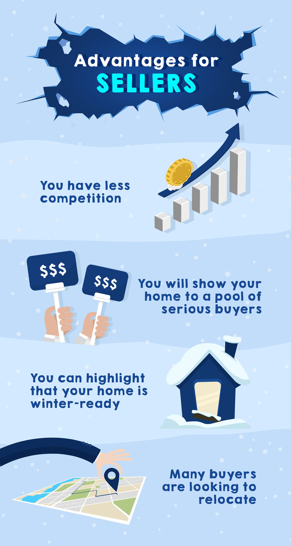 When you put your home in the market during the winter months, there’s a greater chance you’ll attract a pool of real buyers looking to purchase and not those window shoppers who are just curious about the house. These serious buyers want to take advantage of the less competitive market and don’t want to wait until spring to get their hands on their ideal home.